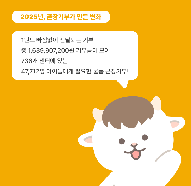 곧장기부는 2020년 12월 론칭 이후 약 5년 만에 누적 모금액 약 50억 원 규모의 플랫폼으로 성장했다. 2025년 기준 누적 기부자는 16,025명에 달하며, 총 7,109개의 모금함이 운영되었다. 그동안 곧장기부는 지역아동센터, 보육원, 한부모가정, 어린이병원 등 아동·청소년을 중심으로 한 다양한 기부처와 함께하며 현장에서 실제로 필요한 물품을 곧장 전달하는 방식을 지속해왔다. 동시에 아동청소년 외 대상과 지원 형태를 확장하기 위한 다양한 시도도 이어가고 있다. 최근에는 어르신 등 신규 대상군으로의 확대와 물품 지원을 넘어선 서비스형 지원 모델을 모색하며 기부의 영역을 넓혀가고 있다.